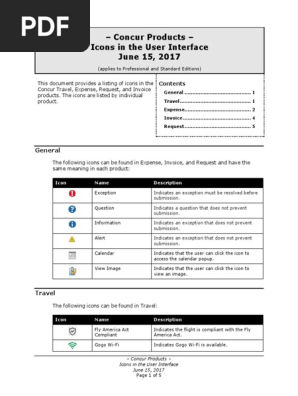 – Concur Products – Icons in the User Interface January 9, 19 Page 1 of 5 – Concur Products – Icons in the User Interface January 9, 19 (applies to Professional and Standard Editions) This document provides a listing of icons in the Concur Travel, Expense, Request, and Invoice products The icons are listed by individual product. Audience SAP Business Users Shortcuts Ctrl S Save the transaction;. (PDF) Concur Icons (PDF) Concur Setting Up/Updating/Deleting Delegates (PDF) Concur Personal Car Management and Claiming Mileage (PDF) Concur Update Default Cost Object (PDF) Concur Review Concur Expense Documents in SAP (PDF) Concur Tracking and Reporting on All Expenses Related to a Trip (PDF).